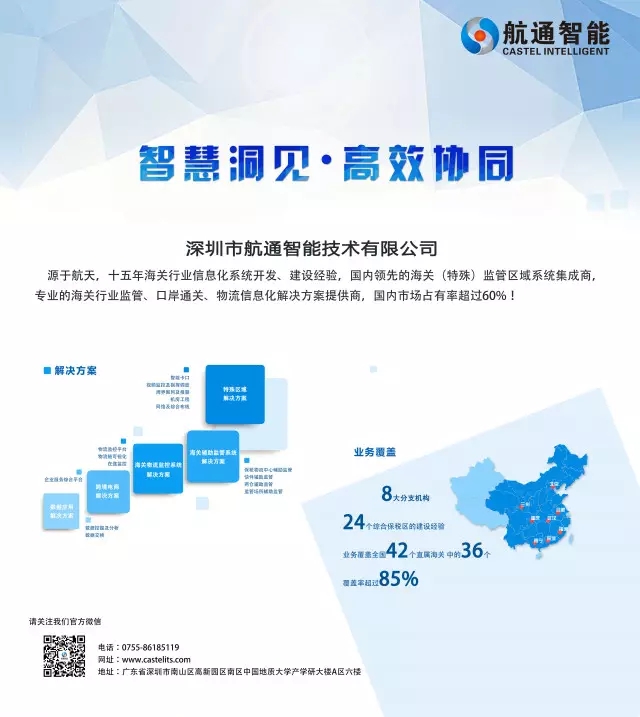 航通智能是國家級高新技術企業(yè)和雙軟認證企業(yè),并獲得CMMI3資質認證。歷程十五載,航通智能已于海關行業(yè)監(jiān)管、口岸通關、保稅物流、加工貿易、物流信息化應用集成領域在全國建設了數(shù)百個特殊監(jiān)管區(qū)與和監(jiān)管場所信息化系統(tǒng)。其中涉及云卡口、大數(shù)據風險分析、北斗/GPS監(jiān)控應用、RFID射頻識別、移動智能終端等應用技術。業(yè)務覆蓋全國42個直屬海關中的36個,關區(qū)覆蓋率超過85%,核心業(yè)務市場占有突破60%。