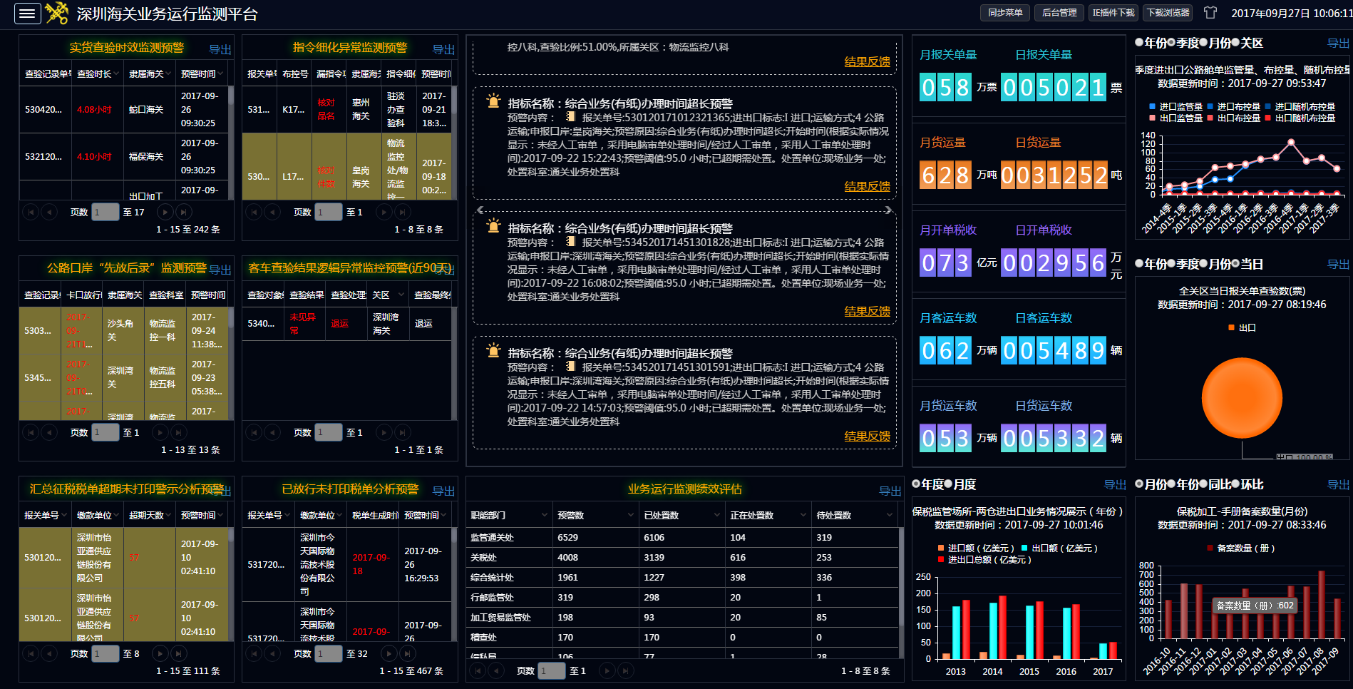 2017年6月14日,海關總署黨組研究決定啟動新一代海關信息系統(tǒng)(H2018系統(tǒng))建設工作。此次升級是在金關工程二期已奠定的強大基礎之上,面對新形勢、新任務和新要求,繼續(xù)堅持“科技強關”戰(zhàn)略,加強了系統(tǒng)的集成整合、互聯互通。深圳海關結合關情、廉情,對職能管控難的問題,以問題和需求為導向,決定啟動深圳海關業(yè)務運行監(jiān)測平臺升級建設工作。航通智能此次助力深圳海關業(yè)務運行監(jiān)測平臺(以下簡稱平臺)建設工作,對平臺進行功能完善和指標補充,提高數據提取的準確性和指標設定的科學性,確保干預和處置的及時性有效性,實現關區(qū)智能管理方式的優(yōu)化轉變。