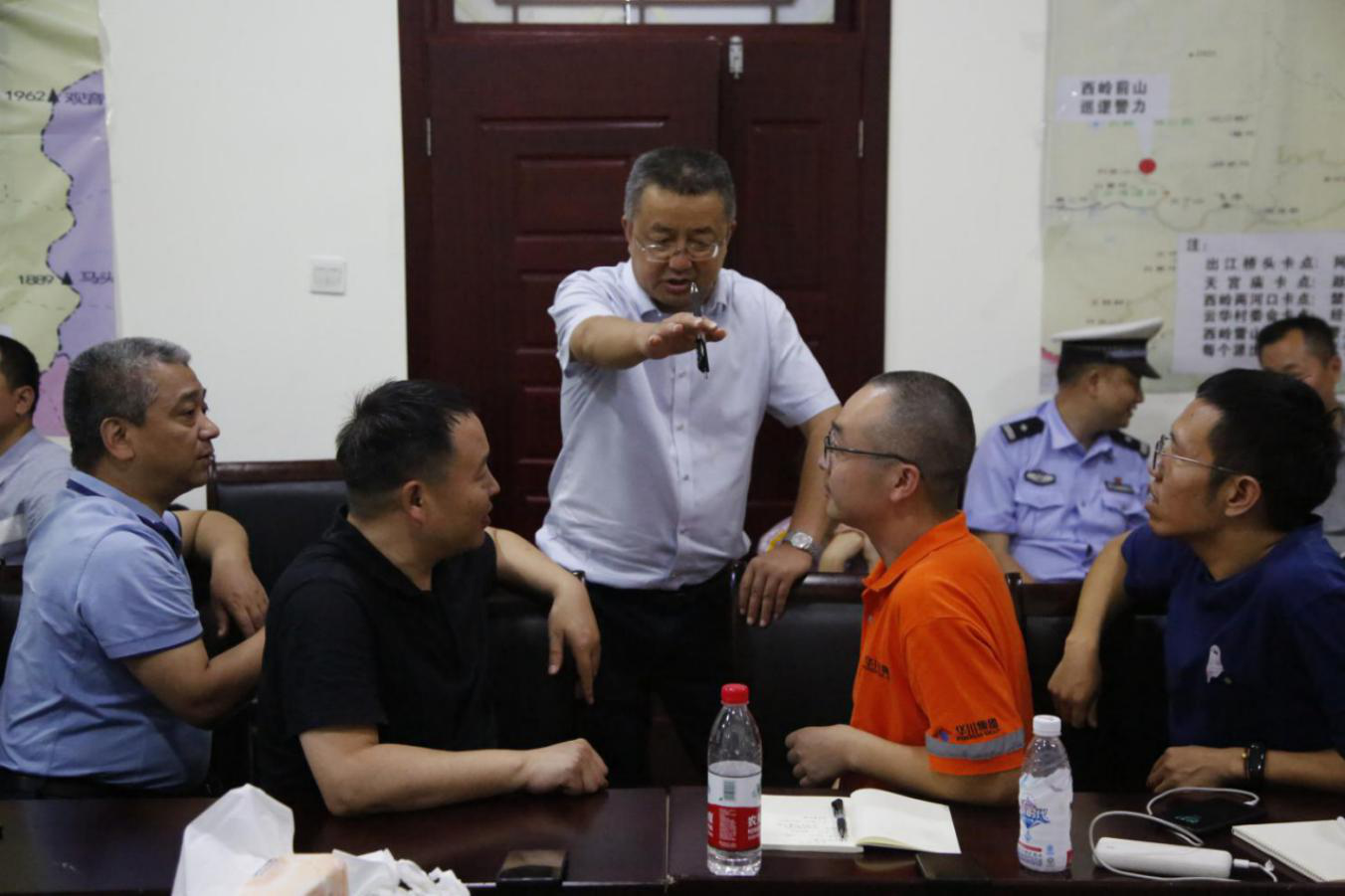 大邑縣交通局副局長(zhǎng)陳建偉與集團(tuán)應(yīng)急搶險(xiǎn)隊(duì)討論搶險(xiǎn)方案