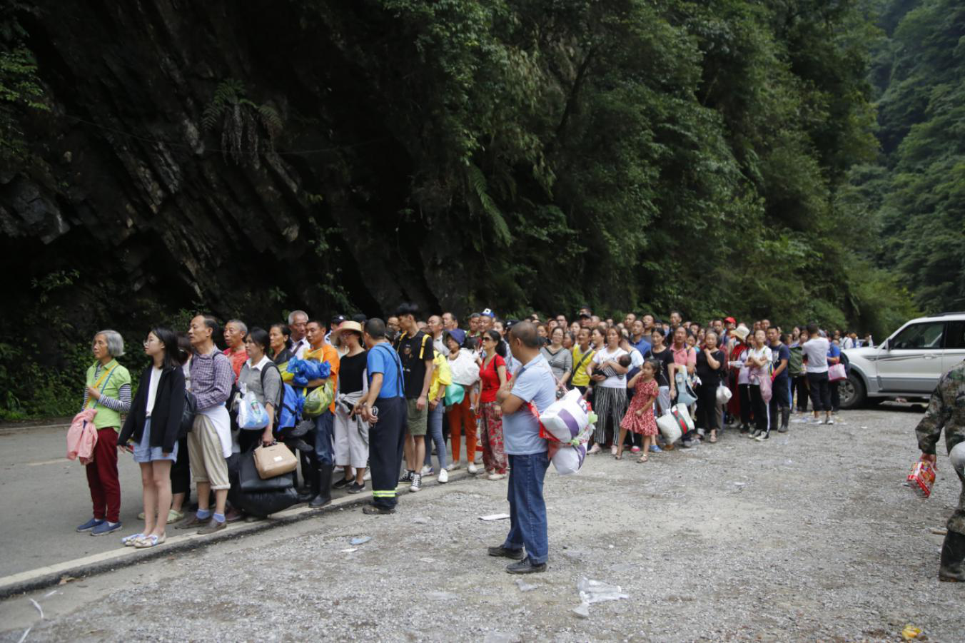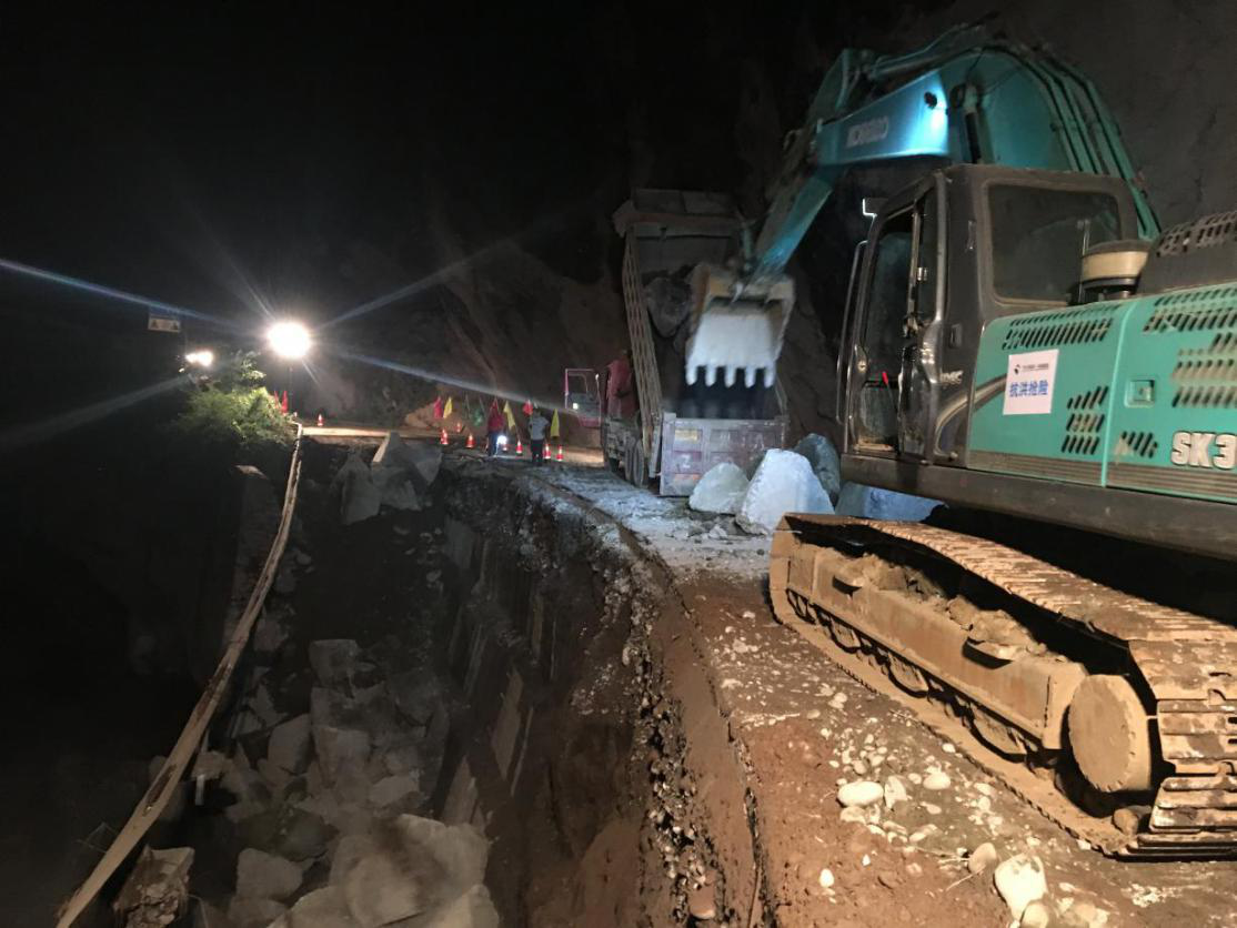 22日,集團(tuán)搶險(xiǎn)隊(duì)伍對(duì)5號(hào)山體滑坡路段進(jìn)行疏通,由于后方路段損毀嚴(yán)重,重型機(jī)械無(wú)法抵達(dá),搶險(xiǎn)隊(duì)員們冒著不斷滾落的滑坡碎石,采用人工清理的方式,用雙手與一塊塊巨大的滑坡石體相抗,最終及時(shí)疏通出一條可供人員通行的生命通道,滯留游客和群眾于22日下午開(kāi)始陸續(xù)撤離。