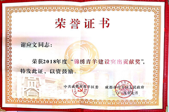 2019年7月,經(jīng)中共成都市青羊區(qū)委辦公室、成都市青羊區(qū)人民政府辦公室評選,集團(tuán)董事長、總裁謝應(yīng)文榮獲2018年度“錦繡青羊建設(shè)突出貢獻(xiàn)獎”先進(jìn)個人稱號。