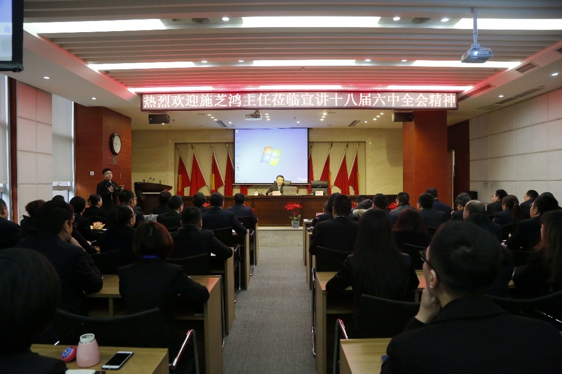 參觀結(jié)束后,施副主任來到集團(tuán)總部一樓會(huì)議廳,用近三個(gè)半小時(shí)時(shí)間,為集團(tuán)全體員工專題宣講黨的十八屆六中全會(huì)精神。他著眼十八屆六中全會(huì)概況、重大歷史貢獻(xiàn)、全會(huì)背景和準(zhǔn)則條例的起草過程,圍繞三大原則和五大規(guī)律性認(rèn)識(shí)、兩條思想紅線、四個(gè)方面的頂層設(shè)計(jì)等內(nèi)容,抽絲剝繭,娓娓道來,系統(tǒng)全面地對(duì)全會(huì)精神進(jìn)行了深入講解。特別是他通過自己參與中央文件起草工作的切身體會(huì)和所感所悟,深入講解了黨的十八大以來,習(xí)近平總書記在“四個(gè)全面”、“五大建設(shè)”總體布局中所體現(xiàn)出的治國理政的大智大勇、鐵肩擔(dān)當(dāng)?shù)念I(lǐng)袖情懷,為集團(tuán)員工更好地理解貫徹全會(huì)精神、準(zhǔn)確把握準(zhǔn)則條例的精神實(shí)質(zhì),提供了有力的幫助和指導(dǎo)。