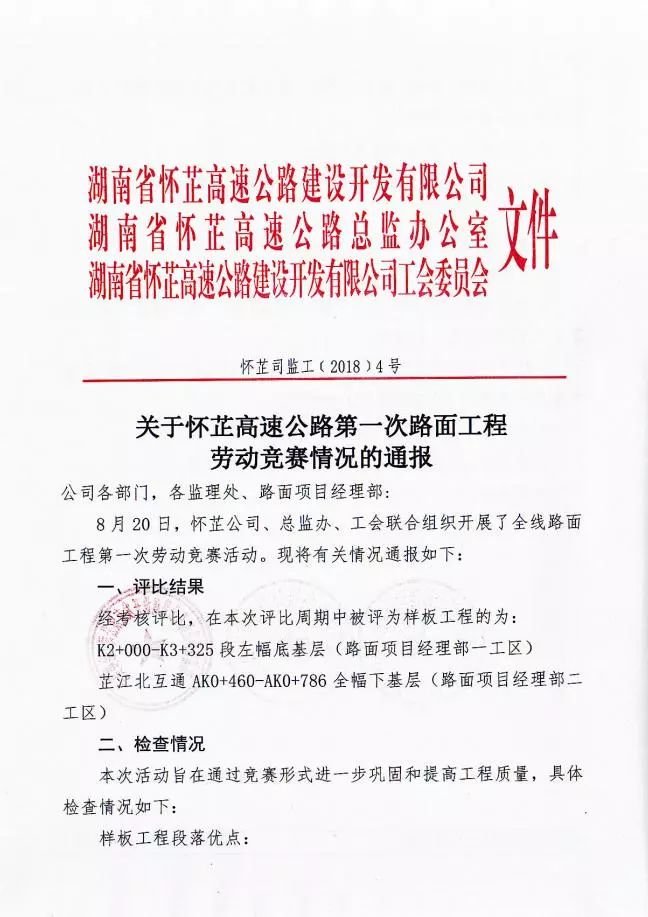 8月20日,懷芷公司、總監(jiān)辦、工會聯(lián)合在懷芷路面工程全線開展了勞動競賽。在本次競賽中,懷芷路面項(xiàng)目高度重視、積極參與。通過嚴(yán)格的原材料控制,科學(xué)的施工安排,高質(zhì)量的施工組織懷芷路面K2+000-K3+325段左幅底基層、芷江北互通AK0+460-AK0+786全幅下基層被評為樣板工程。同時獲得施工拌和、運(yùn)輸、攤鋪、壓實(shí)、養(yǎng)生等工序組織管理好、芯樣完整性好、級配良好、結(jié)構(gòu)密實(shí)、厚度合格等好評,受到懷芷公司現(xiàn)金獎勵。